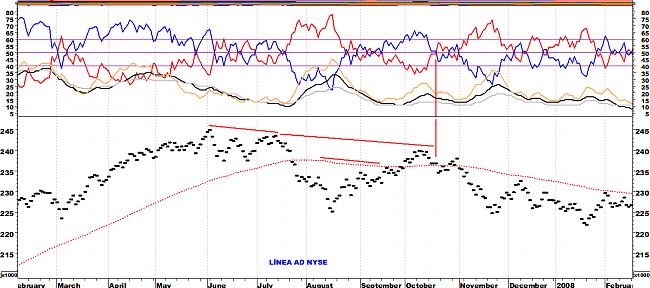 Las dos líneas rojas sobre el Oscilador indican que ya la media de los que bajaban crecía rápidamente mientras los índices seguían su escalada final. Esa divergencia no tiene más que una explicación y es que las pocas acciones que subían eran de tal peso en los índices que, siendo muchas más las que bajaban se mantenía la escalada de las medias/índices.