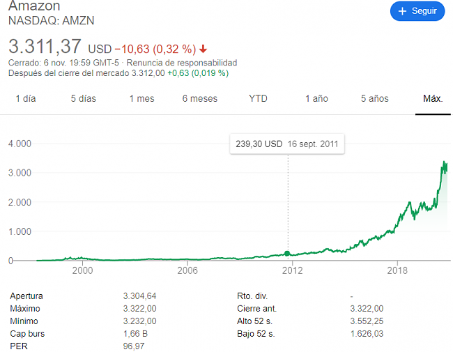 Solo tenemos que ver la acción de AMZN, donde se observa claramente la elevada sobrevaloración con un PER de 90.