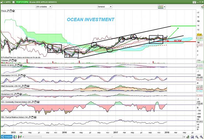 Lentamente parece ir en busca ya de parte alta canal alcista, que ganará en valor tan pronto rompa el lateral que viene desarrollando en el interior del mismo y que ya se ve presionado por la base y MMs reunidas bajo precio cotización. Objetivo Inicial 13,90€. ����