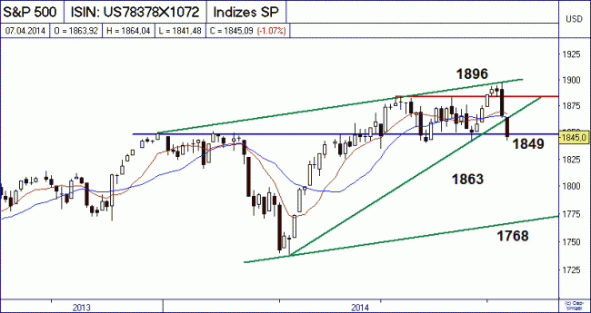 Los puntos de pivote semanales marcaron un objetivo máximo justo por debajo de los 1.850 puntos en el S&P 500. El gráfico 2 muestra el índice descendió ligeramente por debajo de esta zona. Aunque hoy estamos esperando un rebote, la ruptura de la tendencia alcista se tendría que confirmar sin dificultades. En el caso de que el S&P 500 cerrase por debajo de los 1.840 puntos, se activaría un nuevo objetivo bajista con 1.786 puntos. Actualmente, el índice está atrapado en un rango entre los 1.841 y los 1.863 puntos.