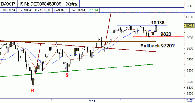 La publicación de los datos del mercado laboral estadounidense para el mes de julio causó una explosión en las bolsas europeas. Las expectativas fueron superadas por creces: Se crearon 288.000 nuevos puestos de trabajo en vez de los 215.000 pronosticadas. En consecuencia, las bolsas en EE.UU. marcaron nuevos máximos históricos. El Dax volvió a conquistar los 10.000 puntos y cerró con ganancias del 1,2 por ciento hasta los 10.029 puntos solamente 20 cifras por debajo del máximo histórico. La reunión del BCE también dio un impulso alcista a los mercados mediante comentarios optimistas sobre la situación coyuntural.