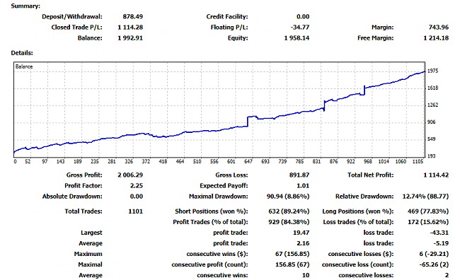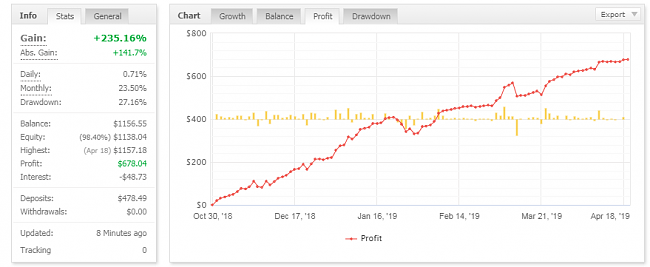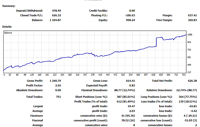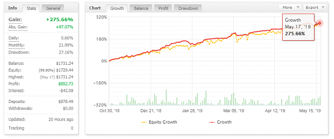 Empezó con 278.49 y ahora tiene 433.51 dólares el riesgo es relativamente bajo, aunque he de reconocer que tarde o temprano puede perder bastante dinero siempre que el mercado entré en una tendencia clara, por ejemplo el EURUSD se vaya a 1,30 o a 1.